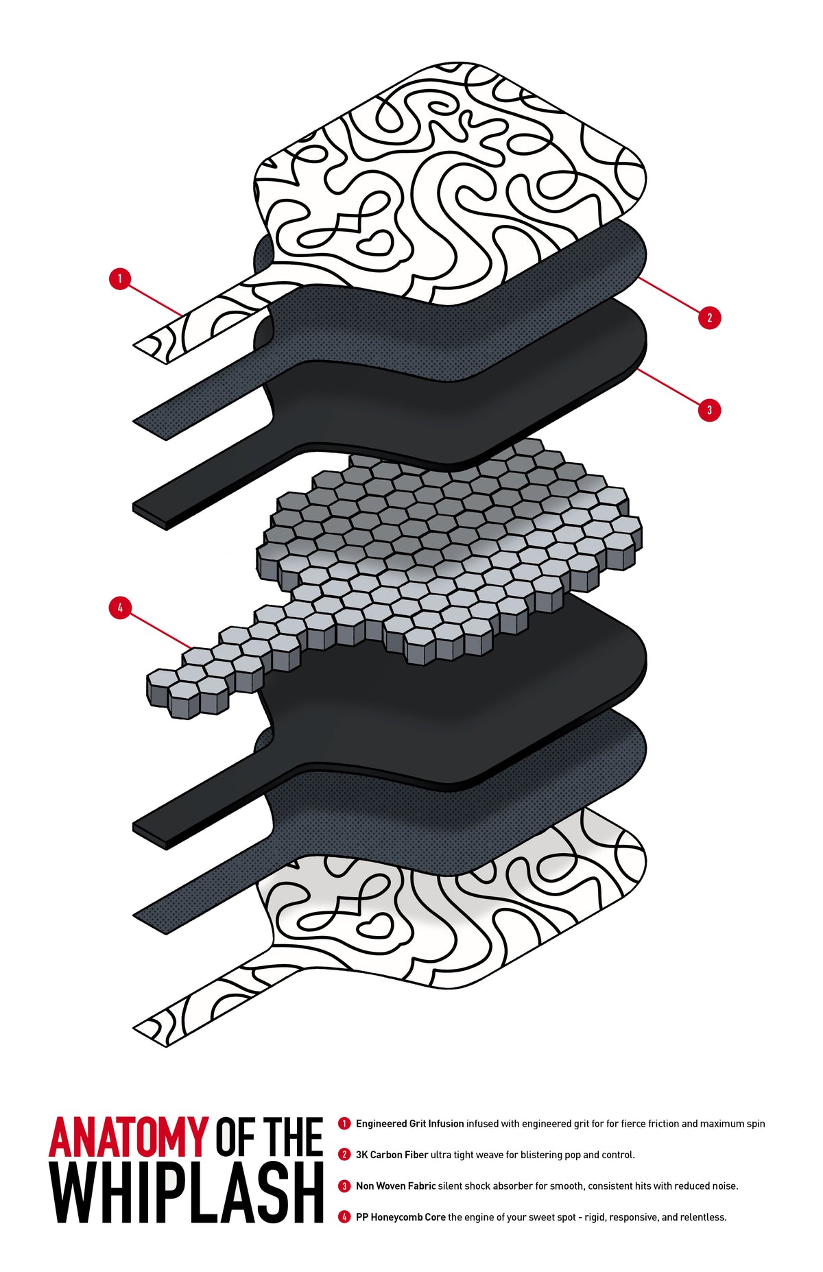 Whiplash Edgeguard - Built with the same pro-grade 3K carbon fiber as its edgeless counterpart, the Whiplash Edgeguard adds reinforced edge protection for lasting durability and balance. Its optimized weight distribution delivers controlled power and heavy spin, giving players total confidence to attack every shot.